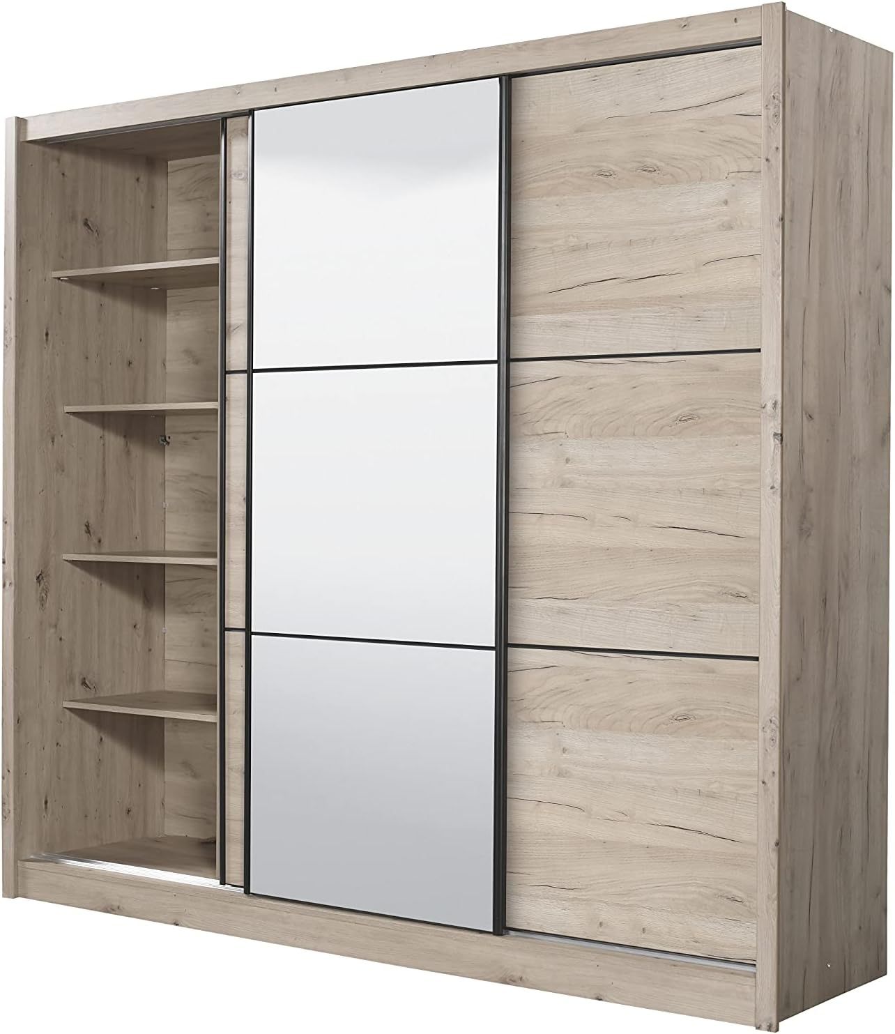 Armadio guardaroba con tre ante scorrevoli di cui una a specchio, rifinita effetto legno quercia naturale. Armadio completo ed estremamente spazioso, perfetto per tenere organizzata la camera da letto e per trovare posto a tutti i tuoi vestiti.