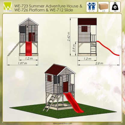 Dimensioni totali: 280×197×242 cm | Altezza piattaforma: 90 cm | Scivolo: 175 cm | Casetta: 120×120 ×155 cm | Porta: 38×104 cm | Spessore pareti: 8 mm | Età consigliata: 3–7 anni | Carico massimo: 100 kg | Peso: 85 kg | Colli: 5 | Uso domestico.