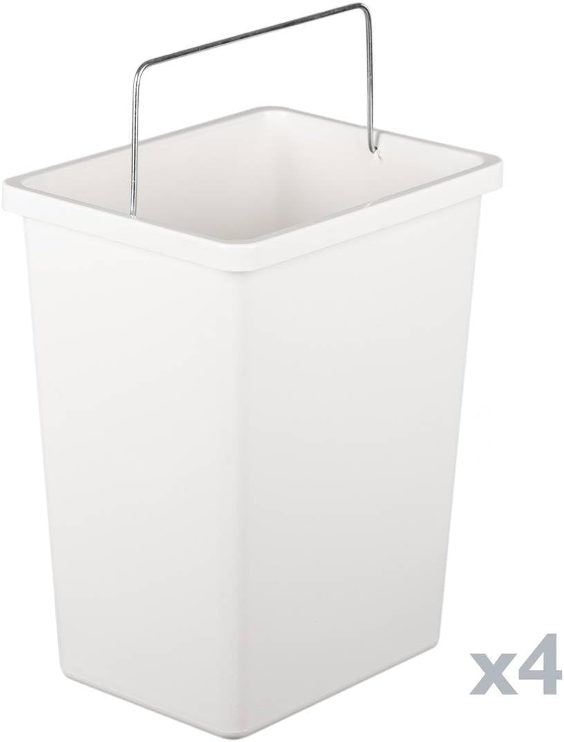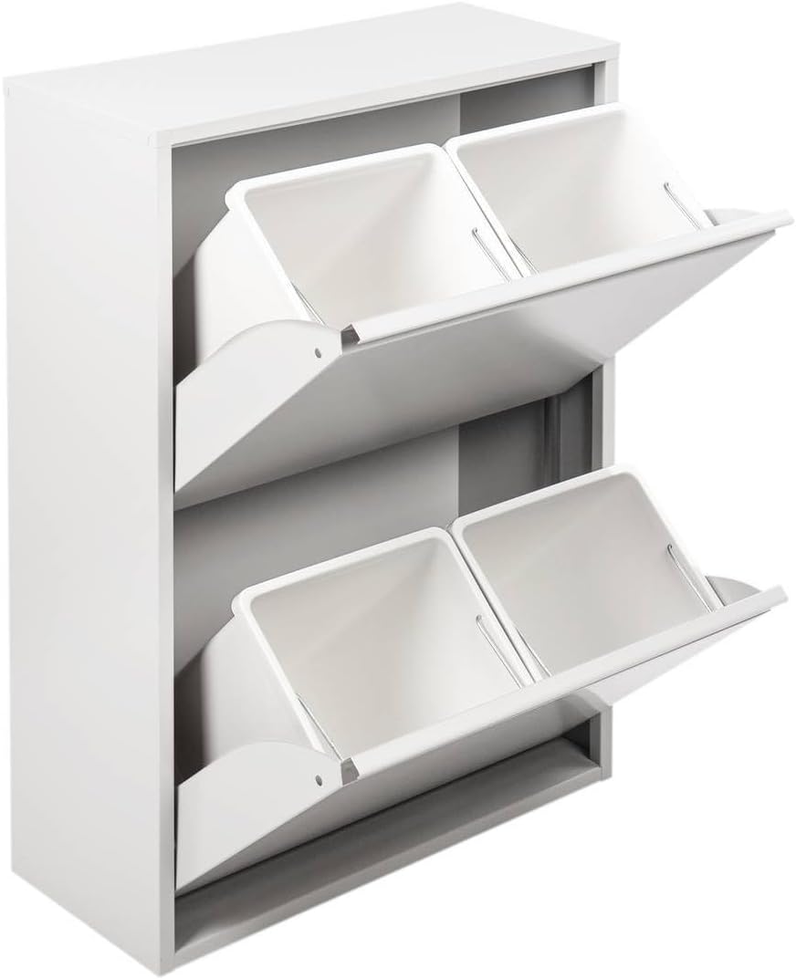 STRUTTURA E UTILIZZO - Mobile in metallo porta rifiuti dotato di quattro secchi per riporre in modo ordinato, carta, plastica, vetro e rifiuti indifferenziati - Il prodotto è dotato di due ante a ribalta contenenti ciascuna due bidoni estraibili con manico - I contenitori estraibili facilitano la pulizia della struttura della pattumiera e garantiscono anche una comoda aggiunta dei sacchi per raccogliere i rifiuti