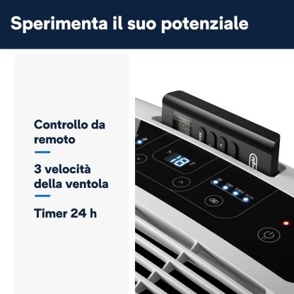 PRATICO: Pannello di controllo tattile intuitivo e facile; Controlla la temperatura, la velocità, il timer e più direttamente sul display o dal telecomando in dotazione; COMFORT Il condizionatore assicura la soddisfazione in termini di comfort, consumo di energia e rispetto dell'ambiente; Raffredda, deumidifica e purifica l'aria