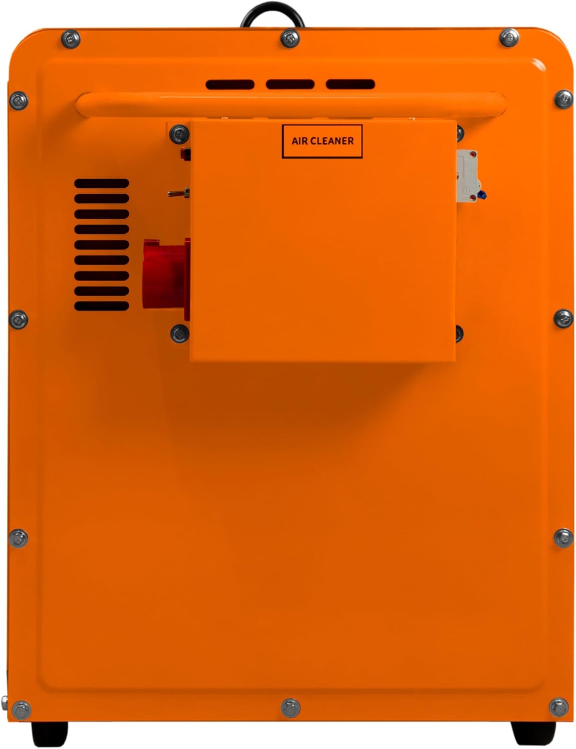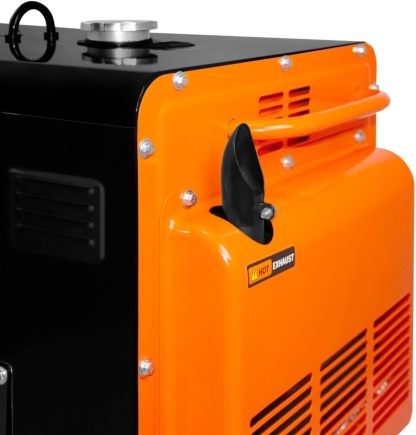 La natura silenziosa di questo generatore è dovuta al design del telaio chiuso che riduce l'emissione sonora al minimo, solo 72 dB a 7 m, per un'esperienza più piacevole durante l'uso. Questo stile aggiunge anche un elemento attraente ma super protettivo alla macchina, nascondendo i meccanismi interni e schermandoli con un robusto acciaio verniciato a polvere. La finitura nera con dettagli arancioni crea un design davvero unico che si integra perfettamente nell'ambiente circostante. Lo spostamento del generatore è facilitato dalle 4 ruote da 20cm e dalla robusta maniglia, montate sul design industriale del telaio.