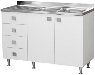 Mobile da Cucina con Lavello in Acciaio Inox 2 Vasche, 2 Ante e 4 Cassetti Bianchi Effetto Legno, Gocciolatoio, 120x50x88 cm (VASCHE A DESTRA)