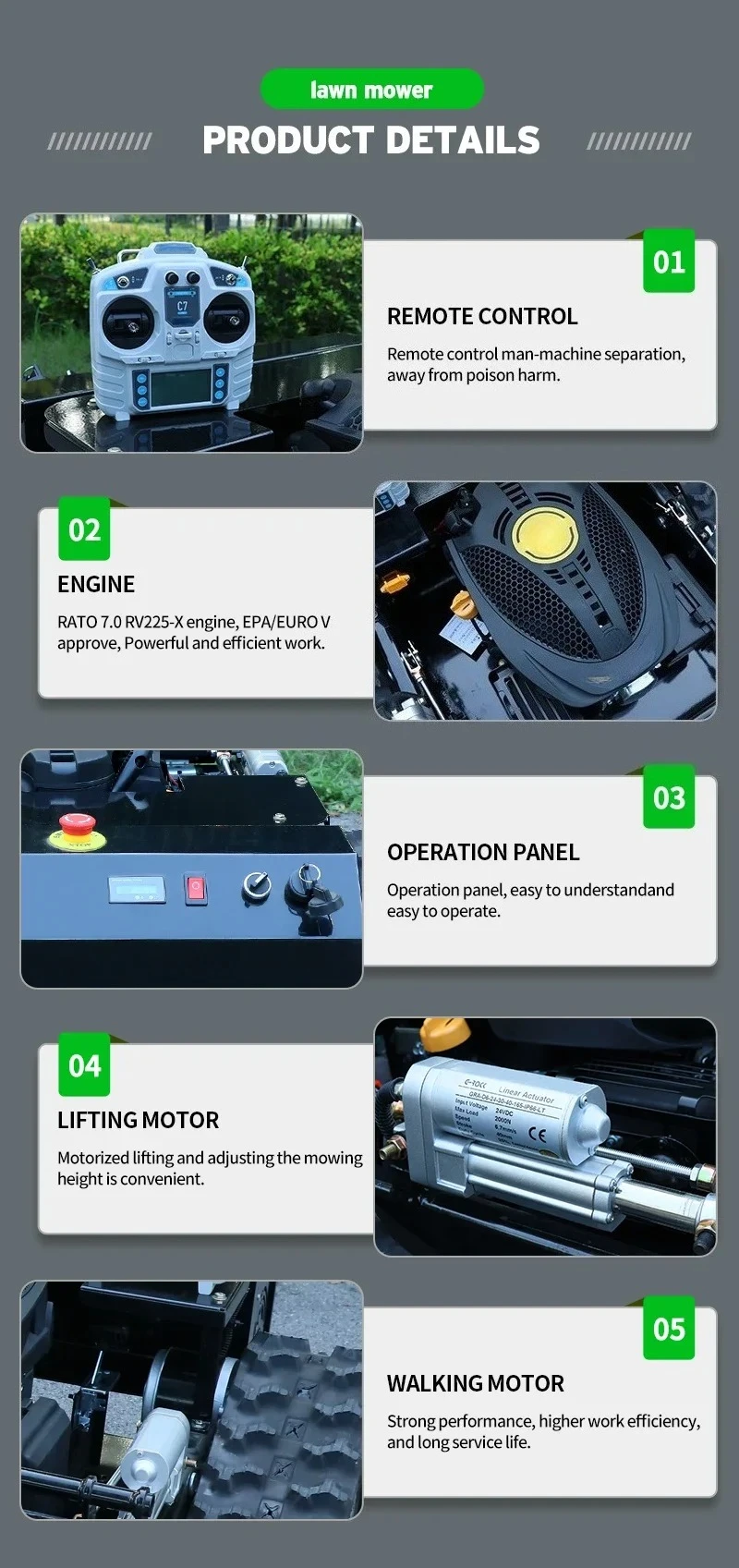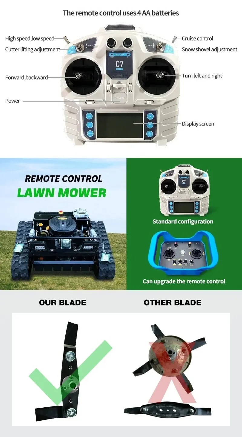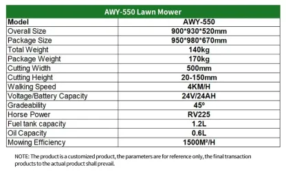Thank you for choosing the AWY550 Robot Remote Control Lawn Mower. This powerful and efficient machine is designed to simplify your lawn care tasks, especially in challenging terrains. Featuring a 224CC gasoline engine with electric start and a robust track system, it offers precise control and excellent maneuverability. This manual provides essential information for safe operation, maintenance, and troubleshooting to ensure optimal performance and longevity of your mower.