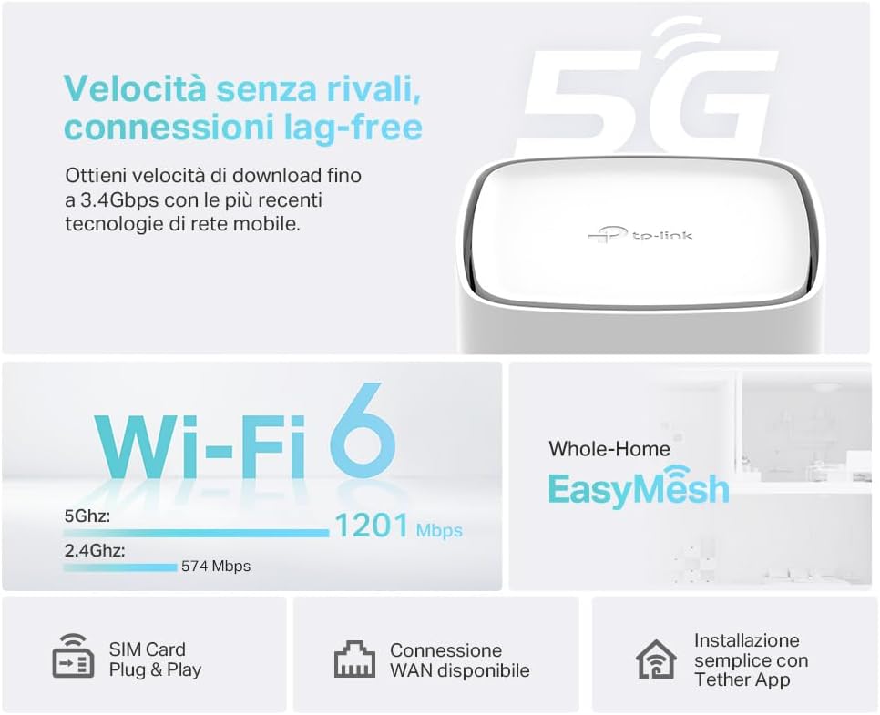 Archer NX200 è la soluzione ideale per la casa e per attività commerciali senza linea fissa. Basta inserire una Nano SIM Card, accendere il dispositivo, sbloccare il PIN e, se necessario, scegliere il profilo del tuo Operatore: in pochi secondi sarai pronto a navigare sulla rete 5G con velocità fino a 4.6 Gbps!