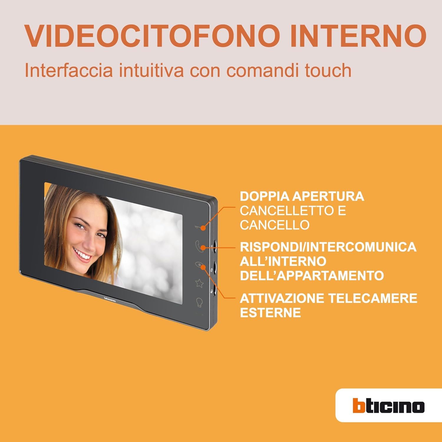 EASYKIT PLUS: Kit videocitofonico monofamiliare pronto all'uso. Include monitor interno, alimentatore plug-in, pulsantiera esterna resistente alle intemperie, staffe, tettuccio antipioggia, canalina copricavi, istruzioni. Cavo a due fili non inclusoAUDIO BIDIREZIONALE: Parla e ascolta i visitatori in tempo reale grazie a microfono e altoparlante integrati. Interagisci con corrieri o ospiti senza aprire la porta e gestisci l'ingresso comodamente con il monitor internoMONITOR DA 7": Display interno da parete nero a specchio, a colori, con vivavoce, intercomunicante. 5 tasti touch per apertura cancello e porta, risposta/intercom, accensione telecamera e luce. Volume suoneria, luminosità e colore immagine regolabiliPULSANTIERA ESTERNA: Controlla l'ingresso con la telecamera grandangolare con visione notturna. Posto esterno dotato di due pulsanti di chiamata retroilluminati, tettuccio antipioggia e finitura in alluminio per essere reistente alle intemperie (IP54)ESPANDIBILE: Acquista e collega fino a 3 monitor interni (Art. 333253, 334253, 335253) per pulsantiera esterna. Soluzione ideale per usare il kit in case bifamiliari o per avere più monitor in case monofamiliari su più pianiGESTISCI FINO A DUE INGRESSI: Acquista una seconda pulsantiera esterna (Art.331860) e collega fino a 6 monitor, massimo 3 per famiglia. Soluzione ideale per abitazioni con due entrate distinte e abitazioni bifamiliariDETTAGLI TECNICI: Il monitor interno e la pulsantiera esterna possono essere installati fino a 100 metri di distanza. L'alimentatore del moitor ha una spina plug-in da 30W e un cavo da 1,85m, espandibile con apposito accessorio incluso in confezioneFACILE DA INSTALLARE: Collega monitor e pulsantiera con un semplice cavo a due fili e apri fino a due ingressi (porta e cancello). Non servono opere murarie e puoi utilizzare il cavo già presente in casa se in buono stato, seguendo le istruzioni